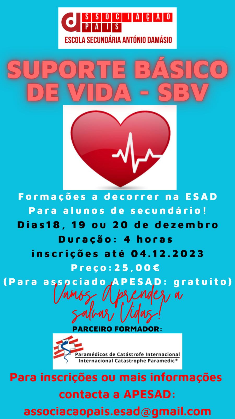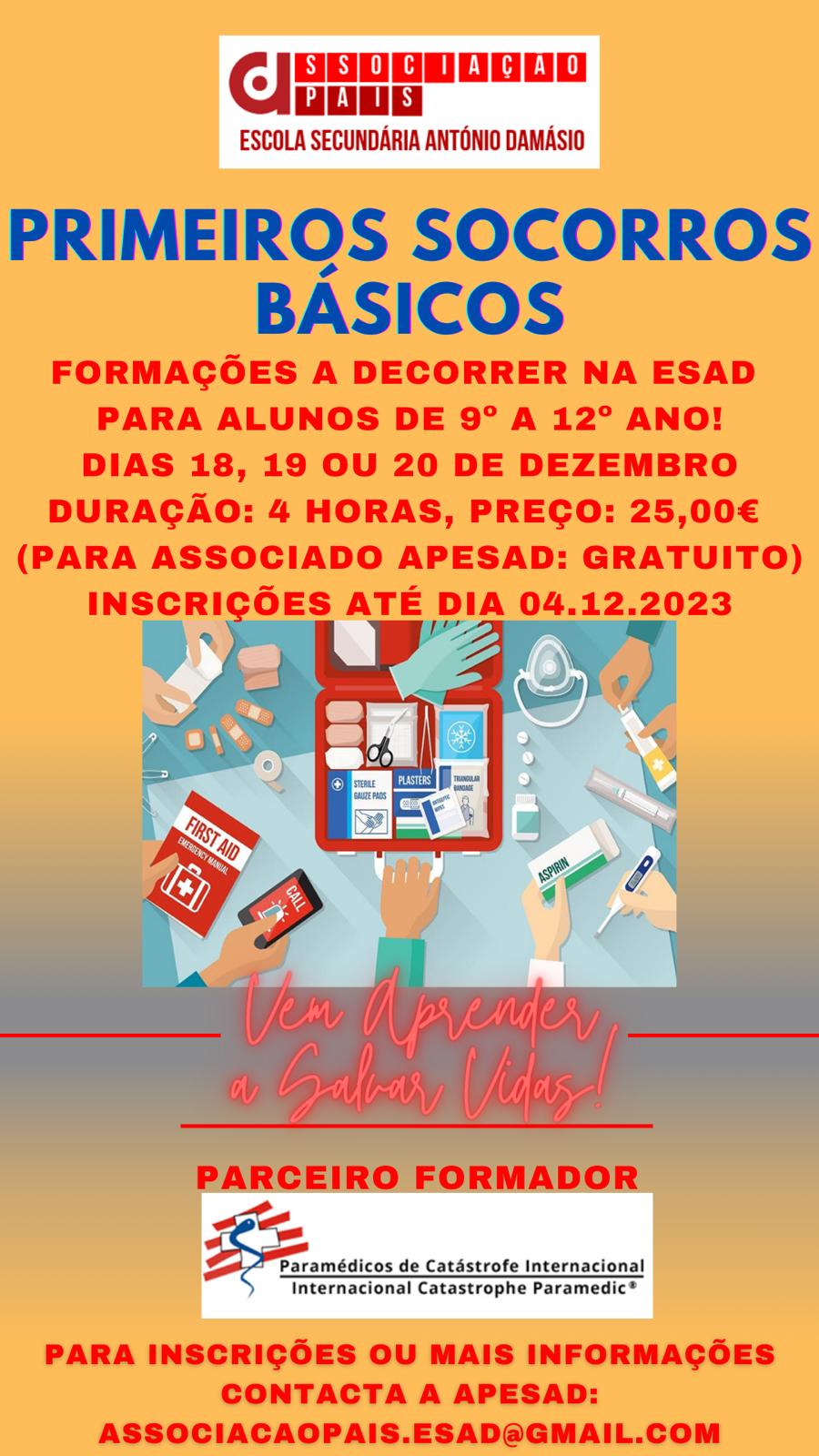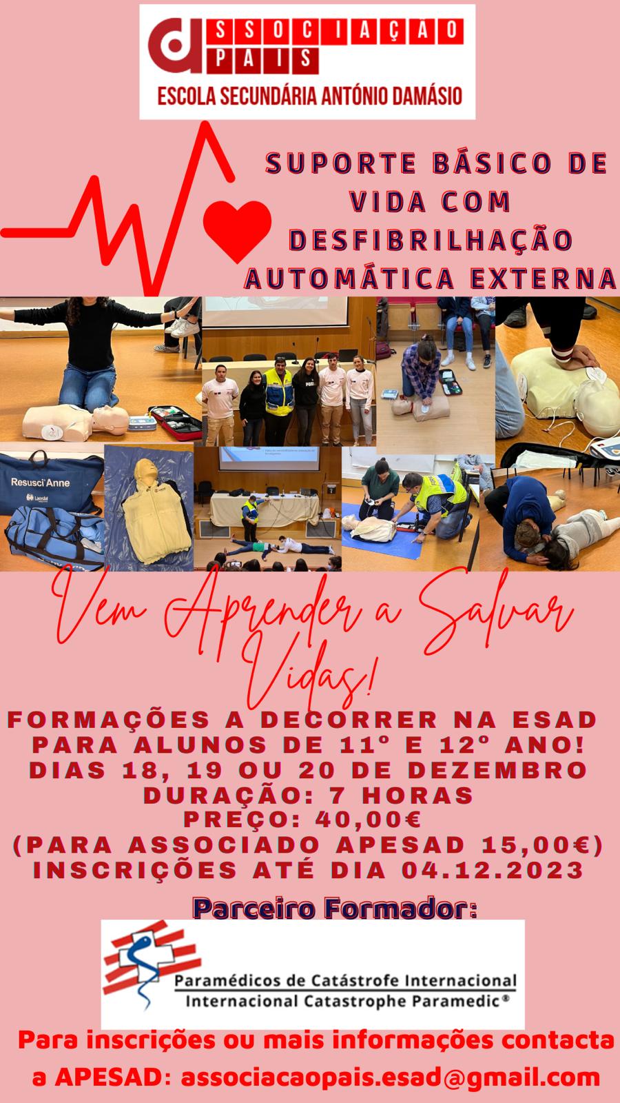 Por solicitação da Associação de Pais, divulgamos as novas datas de formações em Suporte Básico de Vida, Suporte Básico de Vida com Desfibrilhação Automática Externa e Primeiros Socorros Básicos, agendadas para os próximos dias 18, 19 e 20 de dezembro, a decorrerem na ESAD, no âmbito da parceria em vigor com a PCI - Paramédicos de Catástrofe Internacional.