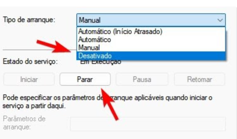 Na janela que será aberta, deve alterar o “Tipo de arranque” para “Desativado”, e clicar em “Parar” para interromper o serviço.